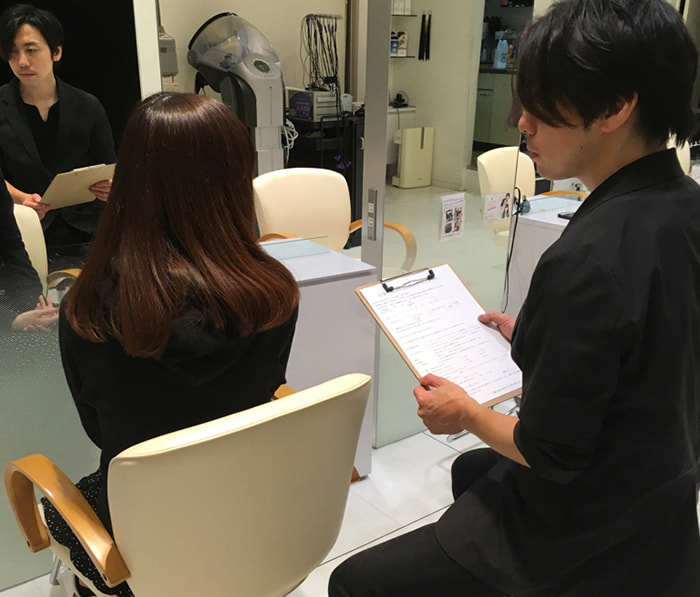 お客様の担当スタイリストが、問診、視診、触診をして髪の現状を確認した後にアルカリ除去の施術に入ります。